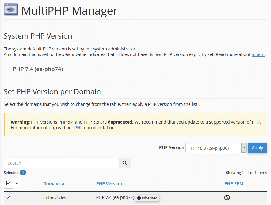 Some control panels use PHP Selector, whereas others use MultiPHP. They both allow you to change the PHP version of your website. The only real difference is that PHP Selector applies the PHP update to your entire web hosting account. In comparison, MultiPHP Manager allows you to update websites individually. If you have two websites on your web hosting account, for instance, you can use MultiPHP Manager to update one of your site’s PHP version while retaining the old PHP version on the other site.