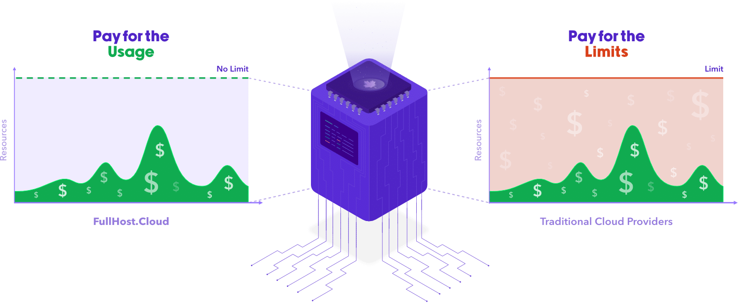 The WordPress Standalone solution is a cost-effective option as it requires only one container for all the hosting processes. The pricing is based on the fair usage-based system offered by FullHost.Cloud, where you are charged only for the resources (RAM, CPU, disk space) that you actually consume and not for the container limits.