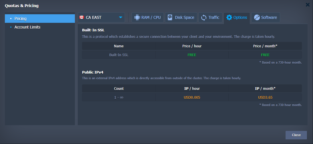 Note: If the Let’s Encrypt option is enabled during the package installation, a public IP will be automatically attached to your container, as it is required for issuing SSL certificates. The cost of public IP addresses can be viewed in the dashboard under the Quotas & Pricing > Pricing > Options frame.