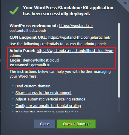 Upon successful installation, all necessary connection information will be displayed in the installation success window and sent via email notification, including: