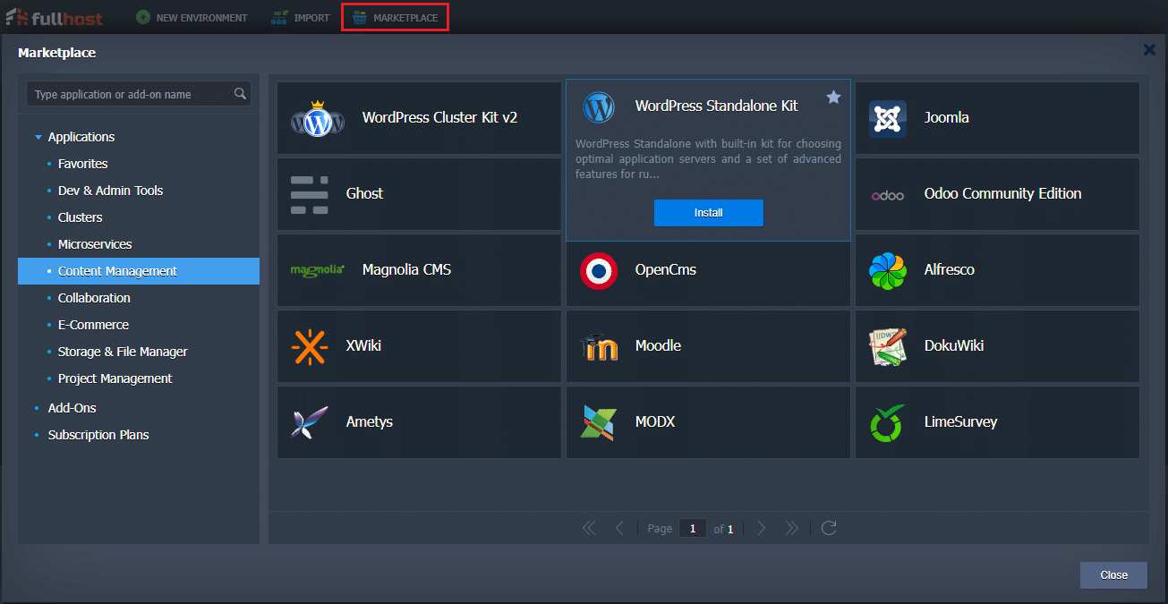 1. Start by clicking “DEPLOY TO FULLHOST.CLOUD” if you don’t have an account yet. The easy-to-follow steps in the widget will help you create a new account and start the installation of WordPress Standalone. For registered users, installation can be done through the FullHost.Cloud Marketplace or by importing the relevant manifest file from GitHub.