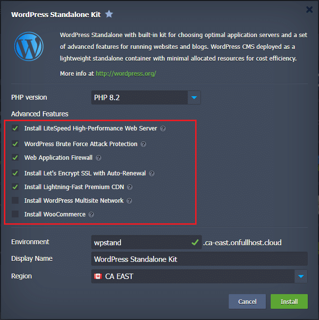 3. Complete the final details of Environment name, Display Name, and Region (if applicable). Simply click the Install button at the bottom of the frame and wait a few minutes for the platform to automatically set up your WordPress installation.