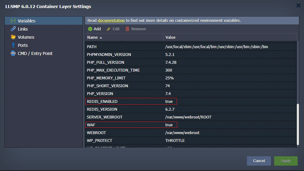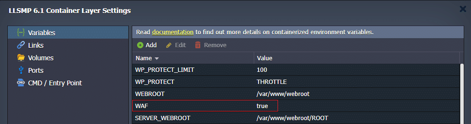 Note: It is not recommended to configure the WAF using the LiteSpeed Web Admin Console after the installation as it may cause failure during horizontal scaling. Instead, the appropriate WAF=TRUE/FALSE environment variable should be used. Remember to restart LLSMP after changing the variable.
