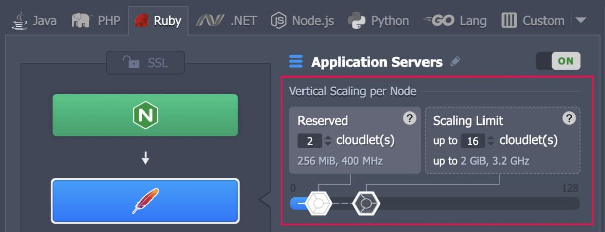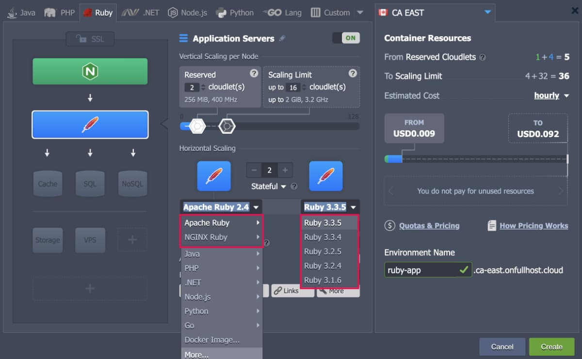 Simply switch to the Ruby tab, select the desired application server and engine version, and add any other required software stacks. You can also adjust additional parameters such as cloudlets (RAM and CPU), disk space, Public IPv4/IPv6, and node count to customize your environment.