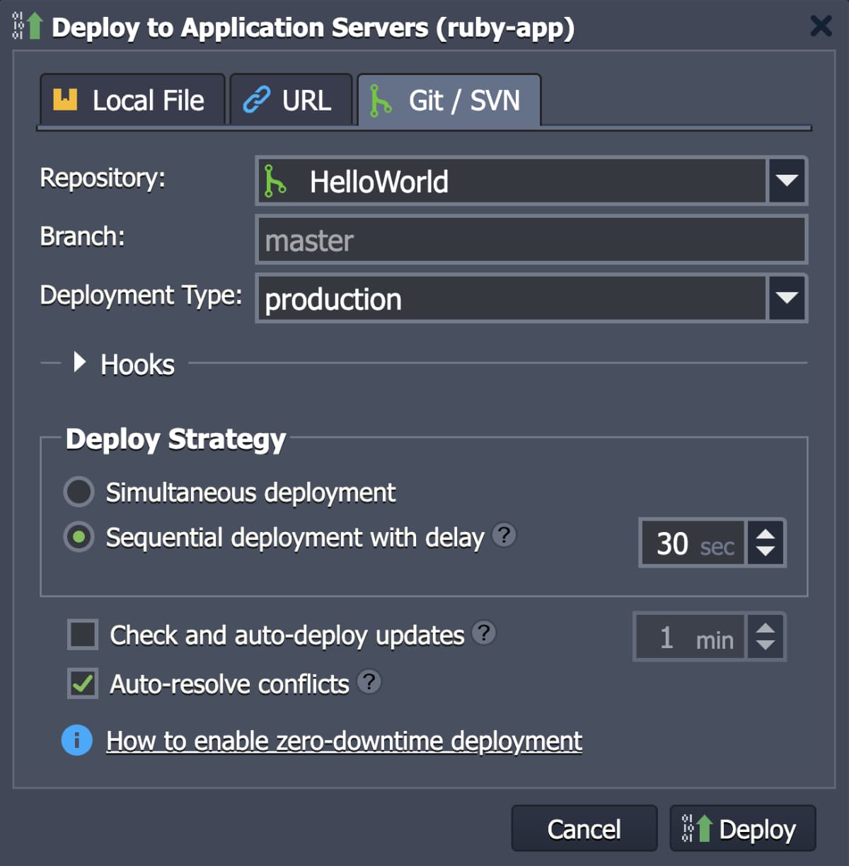 FullHost.Cloud automates the deployment process for managed Apache Ruby and NGINX Ruby application servers using the following methods: