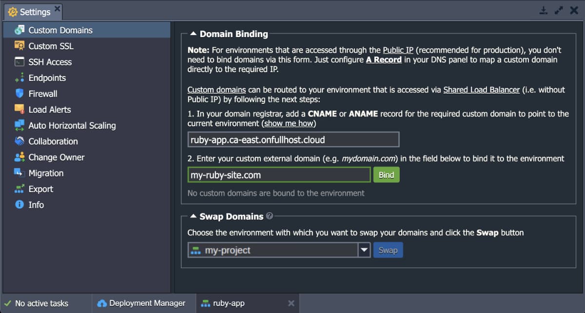 You can assign a custom domain name to your Ruby application instead of using the default one. Depending on your environment topology, use the following methods:
