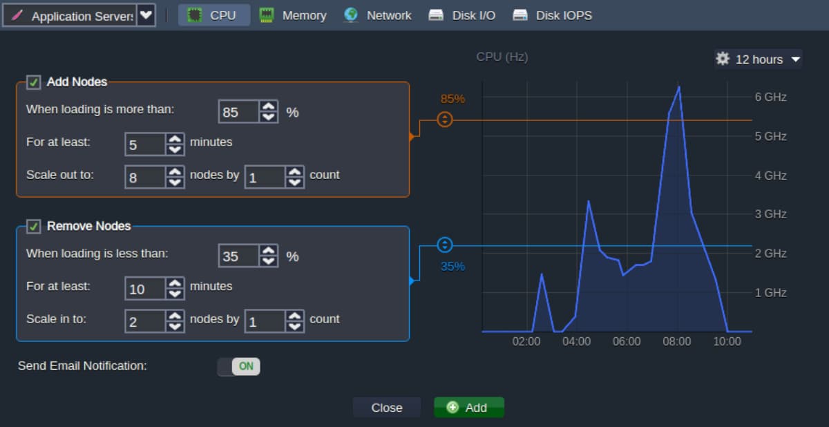 To set this up, go to Settings > Monitoring > Auto Horizontal Scaling in your environment. Select the layer and resource to be monitored (CPU, RAM, Network, Disk I/O, or Disk IOPS). Then, define the specific conditions and scaling rules using the intuitive UI form. The platform will automatically increase or decrease the number of nodes based on the load, ensuring optimal performance.